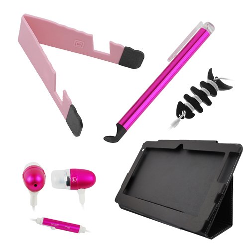 Cheap GTMax Pink Mini Stand for Tablet + Black Folio Leather Protector Cover Case with Stand + 3.5mm Soft Gel Microphone Headset + Universal Stylus with Flat Tip + Fishbone Headset Wrap for Viewsonic G-Tablet Review
